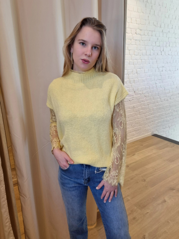 zacht truitje met kanten mouwen, hangen vast aan de trui, kanten hals