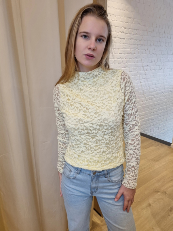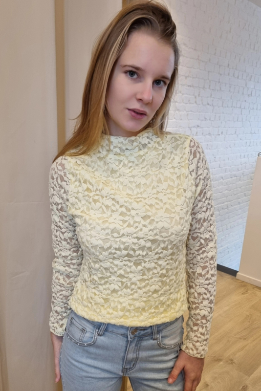 stretchende top met kant, borst en rug volledig gevoerd en dus niet doorzichtig, aan de armen wel