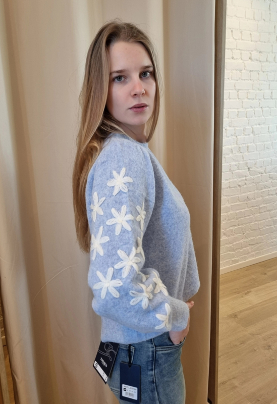 trui met geborduurd bloemenmotief op de armen blauw