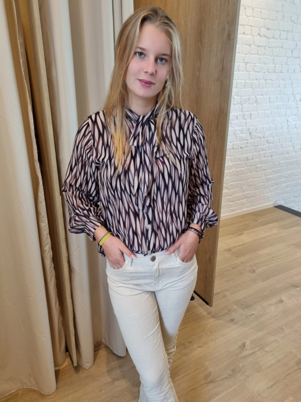 vrolijk bloesje met striklintje dat je hoog of lager kan knopen