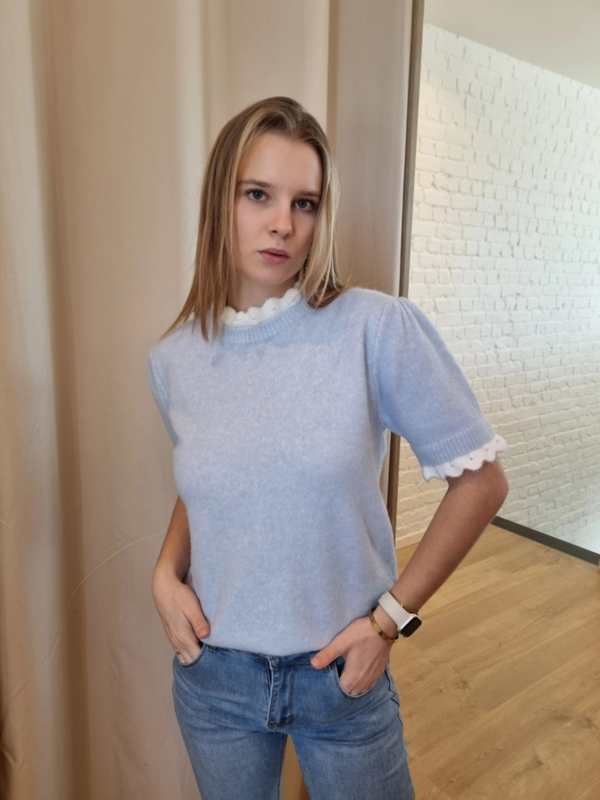 trui met korte mouwen en kanten afwerking aan hals lichtblauw