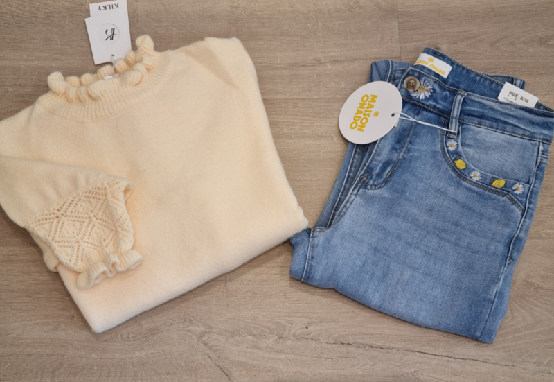 zachte trui met motief aan de polsen en frulletjes aan de hals