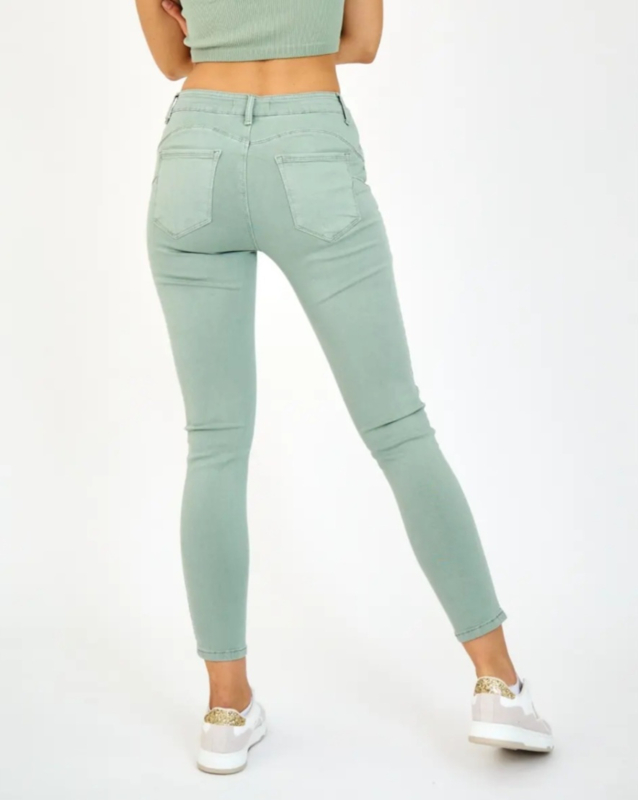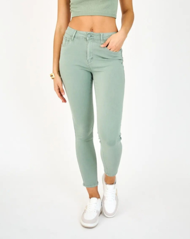 middelhoge taille flex stretch mosgroenzeer stretchende katoenen broek in mooie kleur