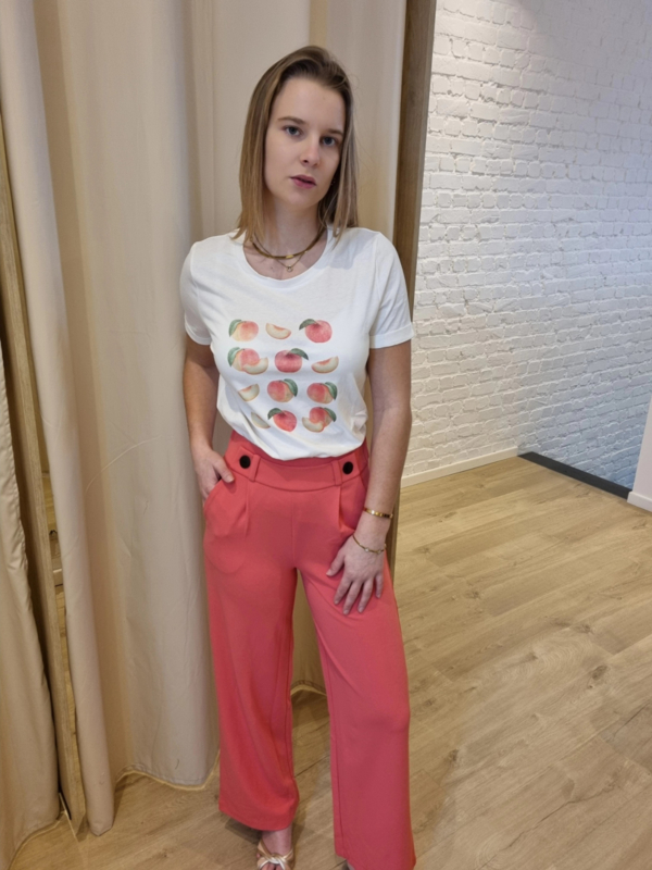 mooi T-shirt met ietsje langere mouwtjes en toffe perzikprint, past ideaal bij de koraal broek uit linnen/viscose