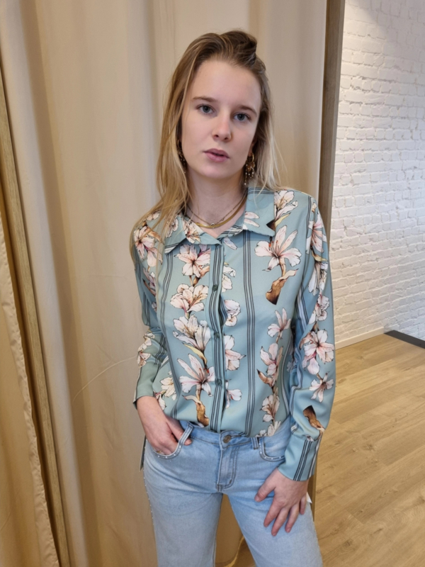 blouse met munt en fuchsia bloemenprintleuke blouse met frulletjes aan de hals