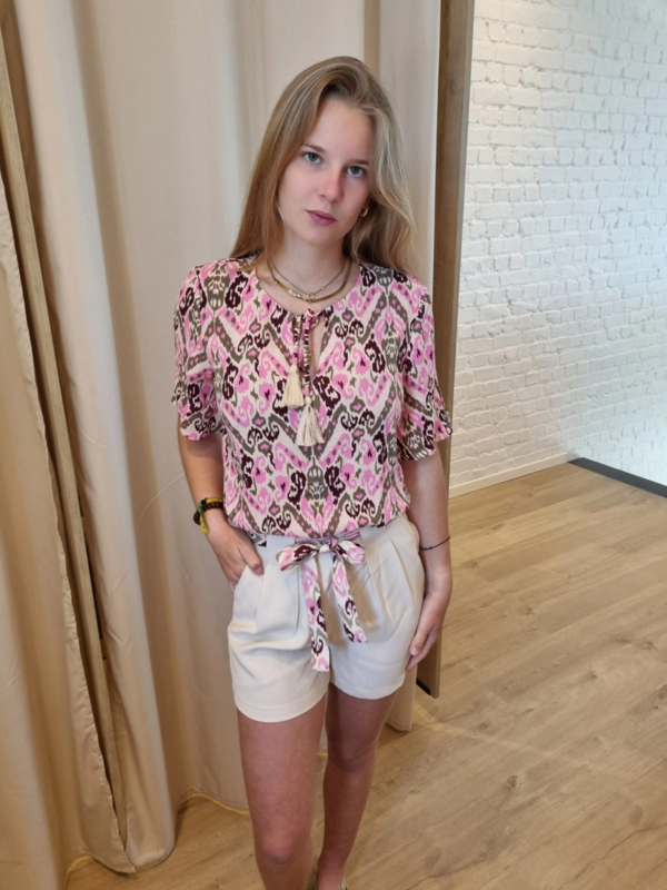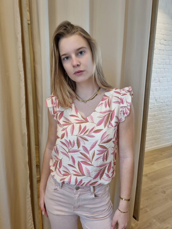 bloesje met volantmouwtjes en bindlintje rozekatoenen bloesje met klein motief in speels roze