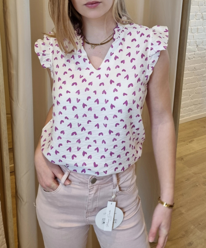 bloesje met volantmouwtjes en frulletjes met hartjesmotiefkatoenen bloesje met klein motief in speels lila