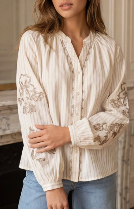 bloesje met broderie licht beigemooie blouse in katoen met gouden broderiedetail