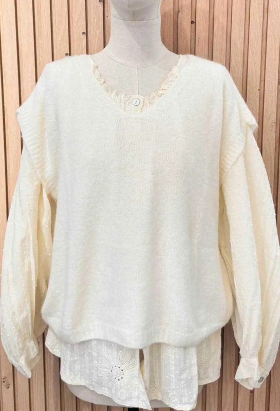 trui met V-hals en versierde mouwen ecruzachte trui met versierde mouwen