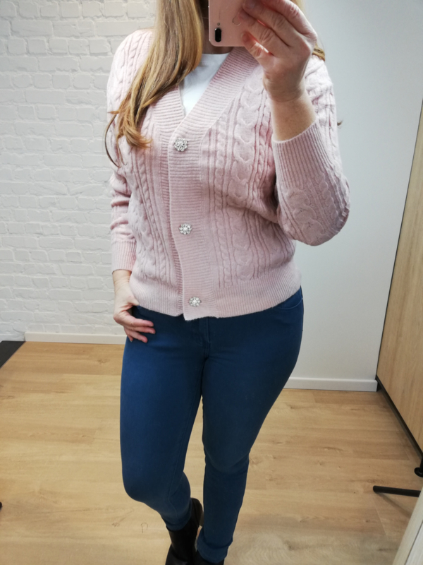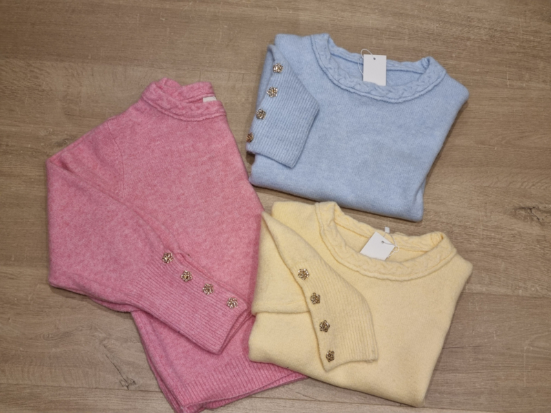 zachte trui met gouden bloemenknopjes aan de pols lichtblauwmooie zachte trui met bloemenknopjes