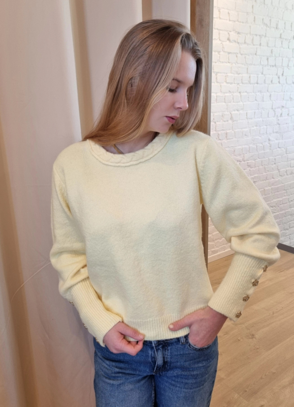 zachte trui met gouden bloemenknopjes lichtgeelmooie zachte trui met bloemenknopjes