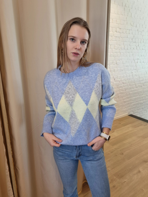 trui met lichtblauwe kleurvakkentrui in zachte stof met kleurige vlakken